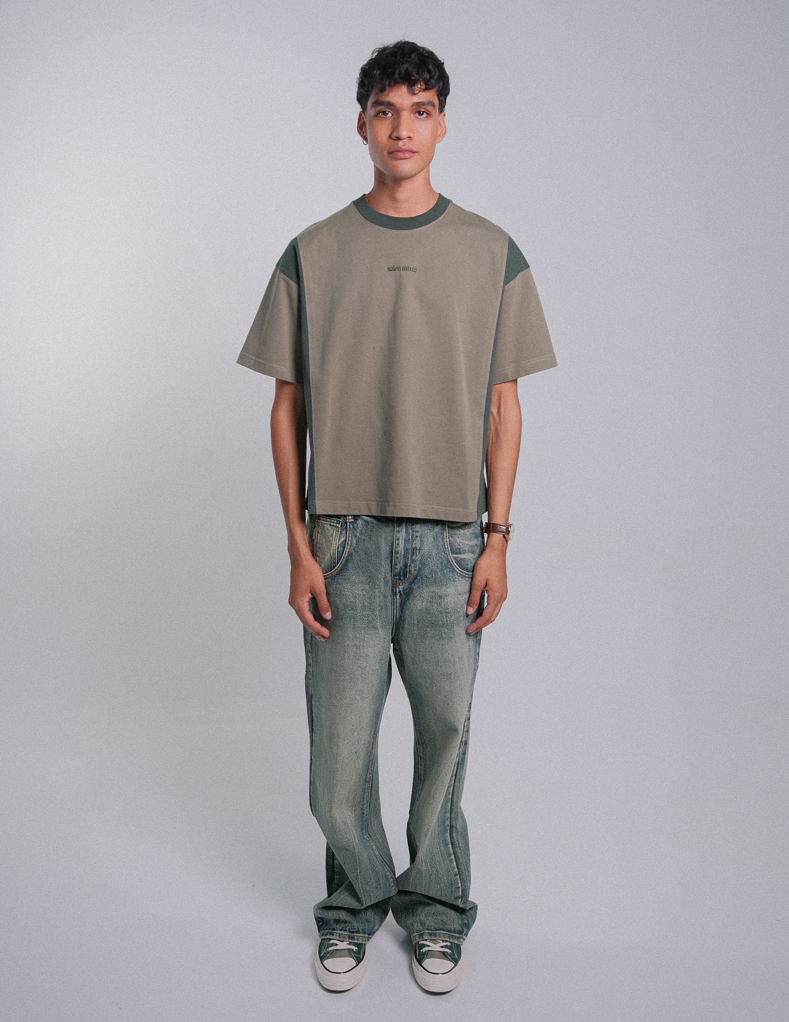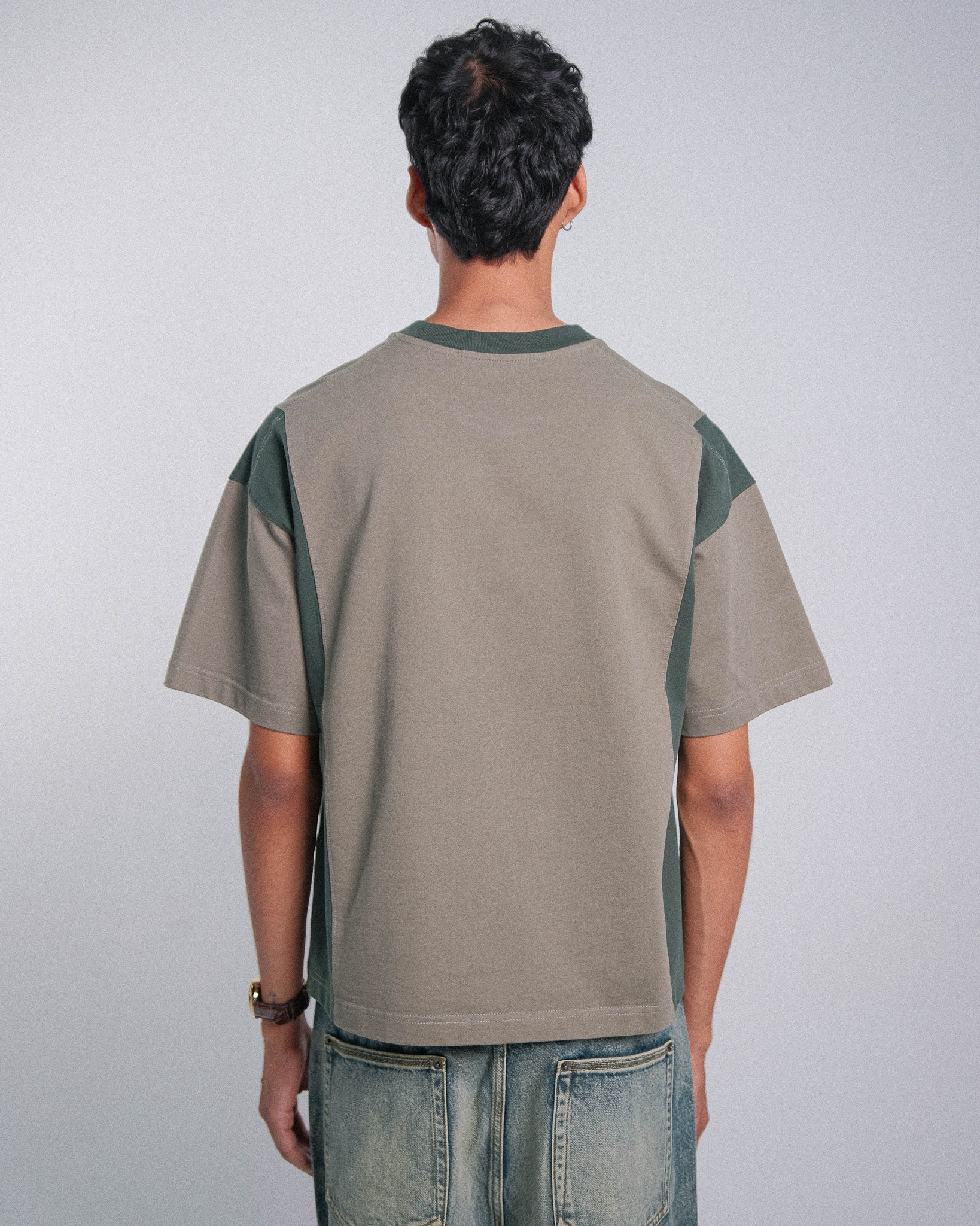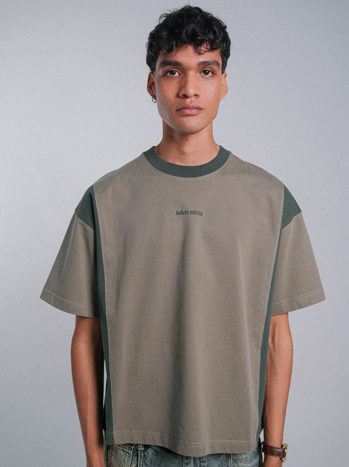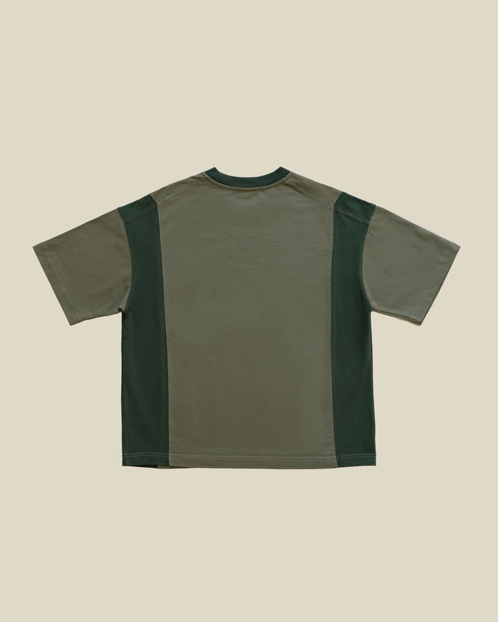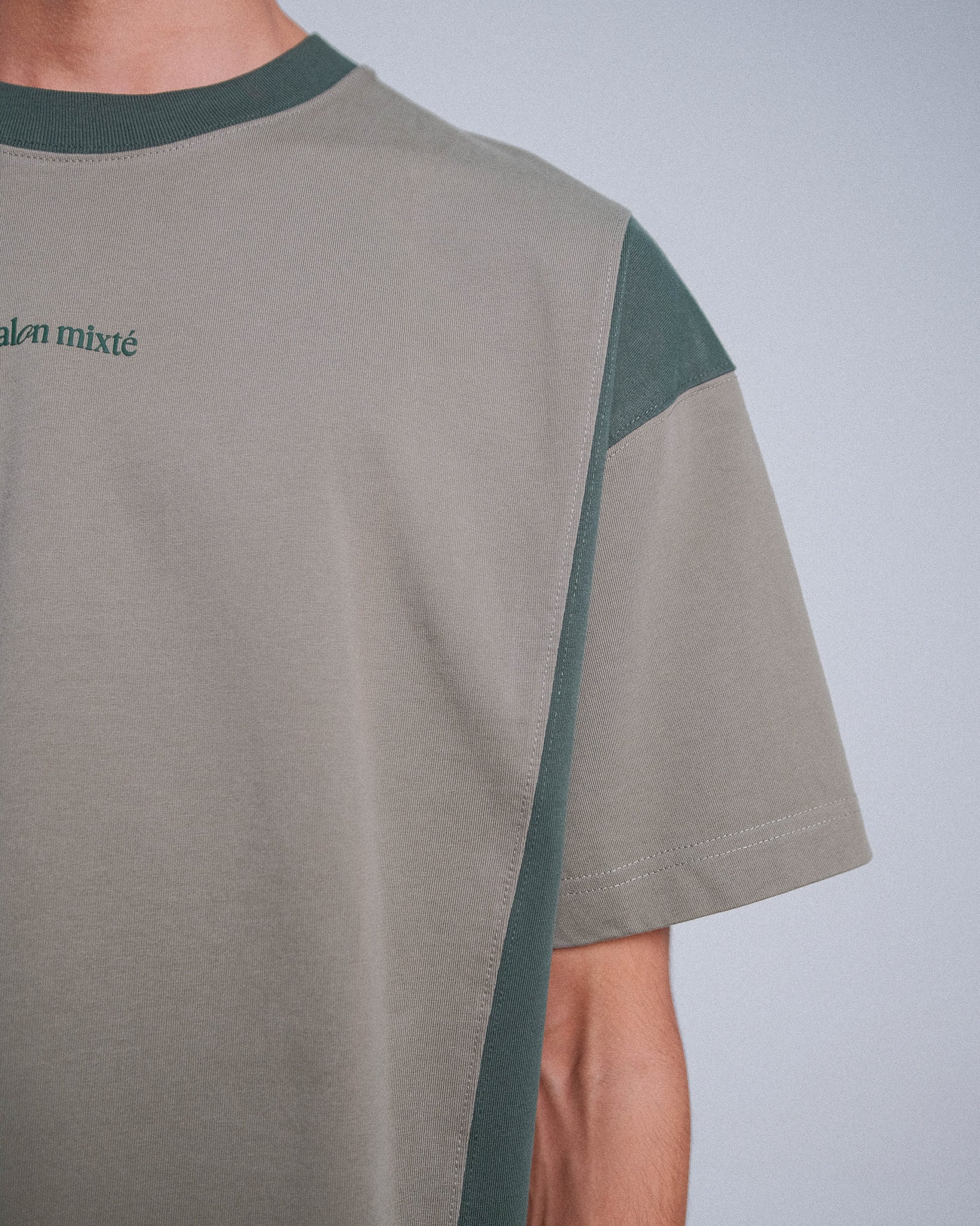 Camiseta boxy fit combinando dos tipos de colores verde, con un estampado puff en la parte delantera, hecha en tela 100% algodón de 290 gr y cuello redondo en rib