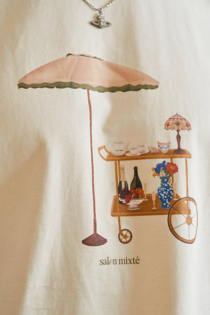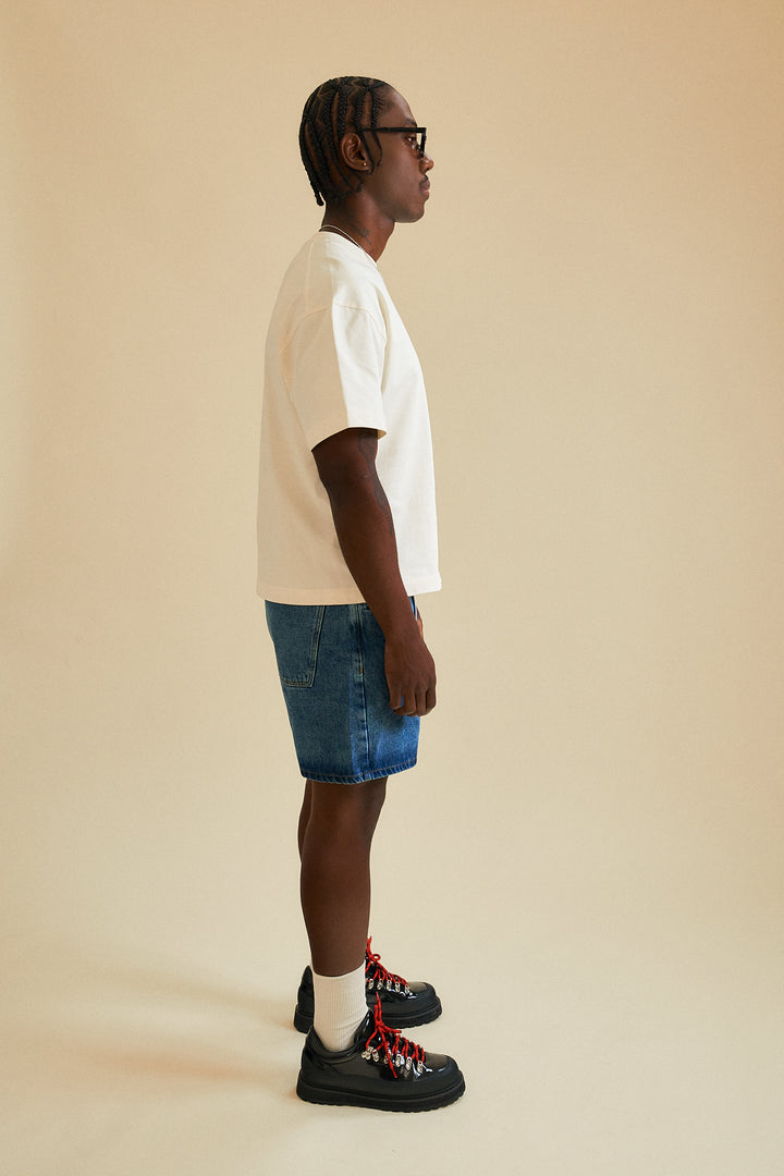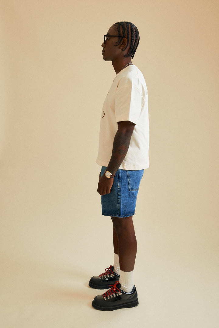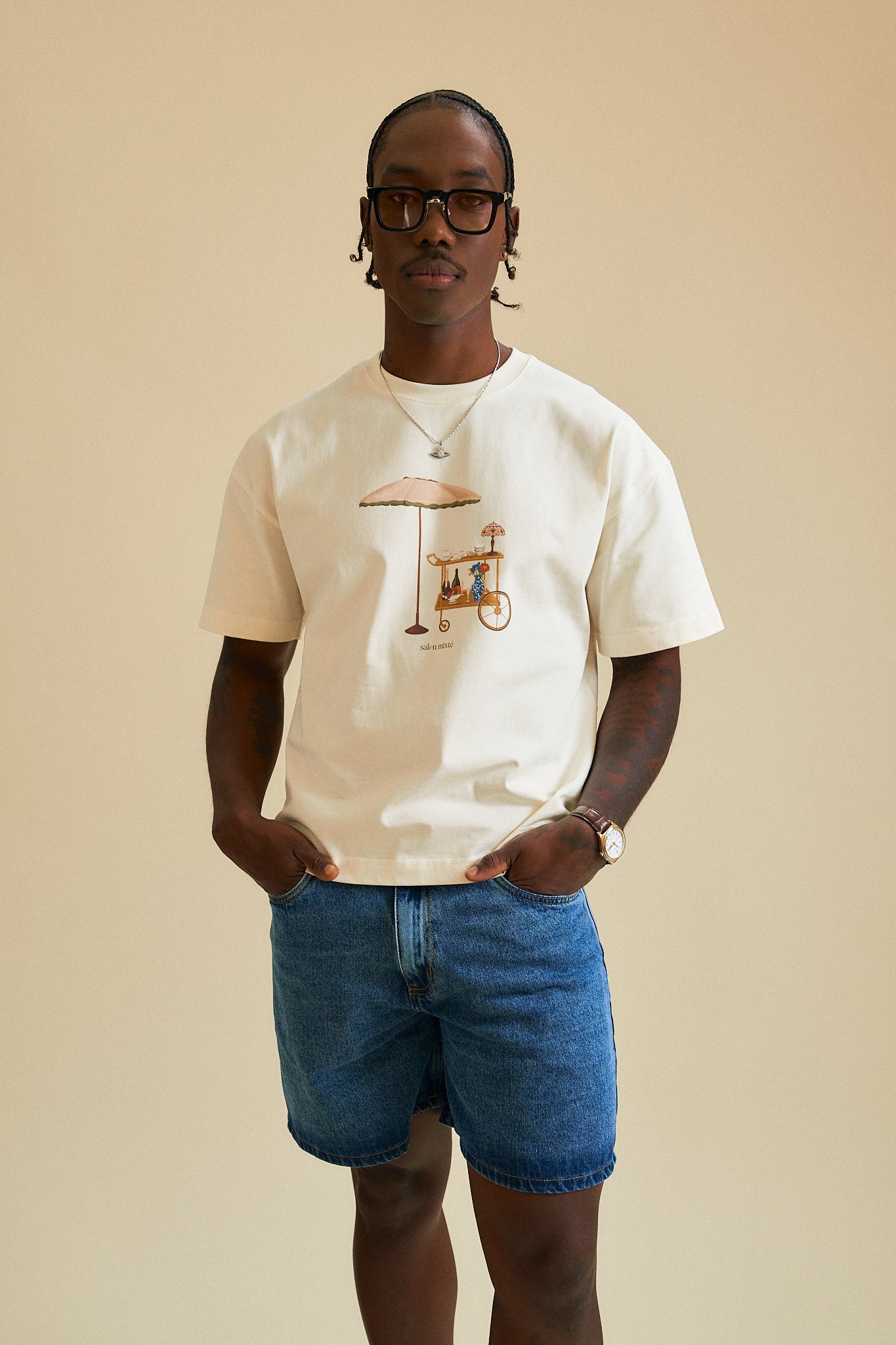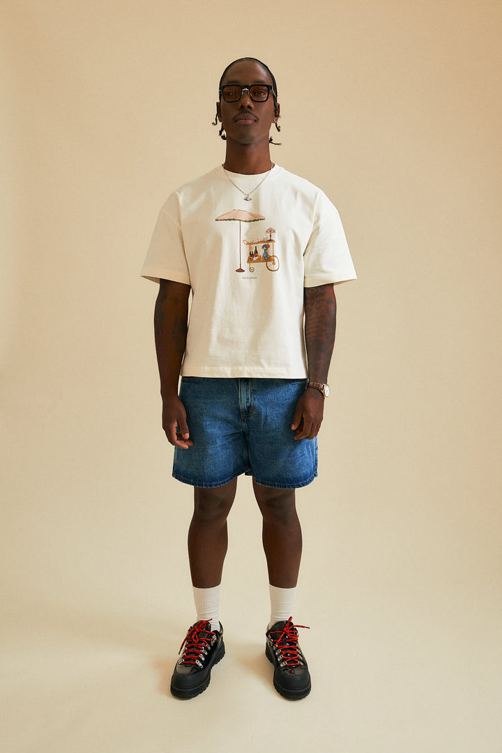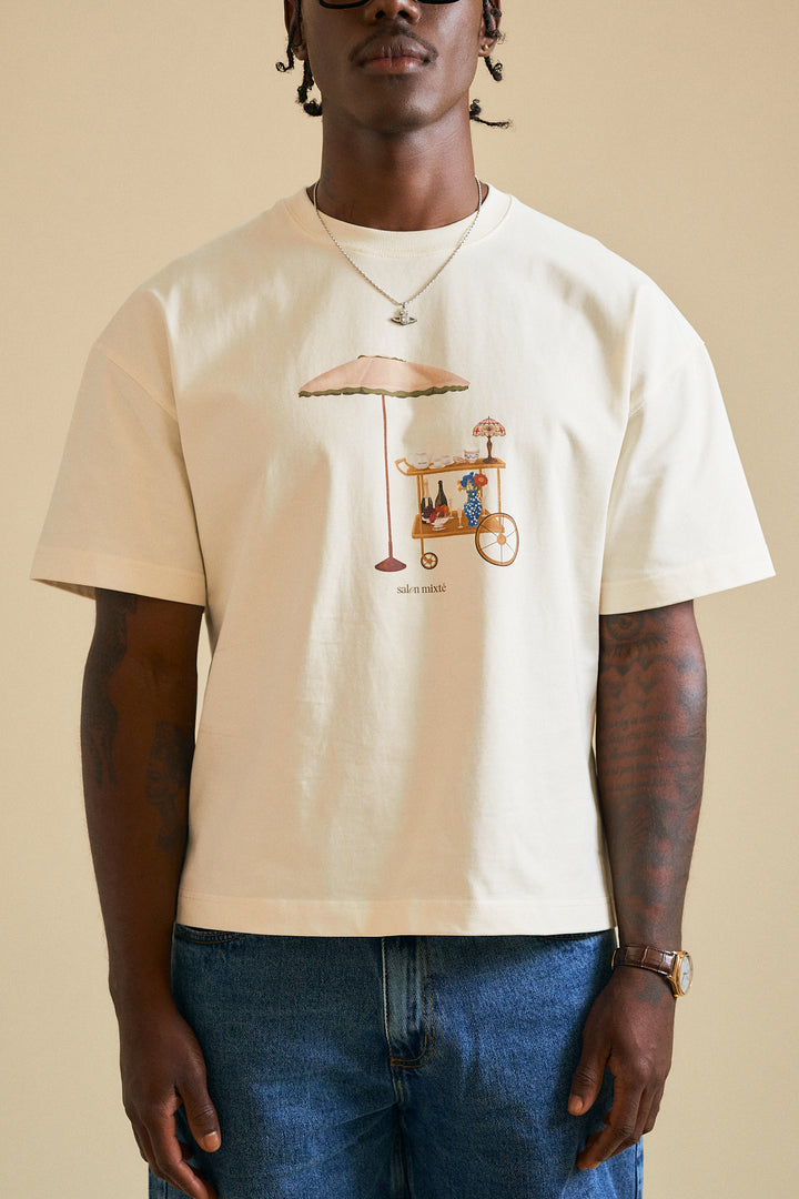 Camiseta boxy fit color crema con una ilustracion en estampado digital en el pecho y en la parte trasera tiene una pequeña estampacion, hecha en tela 100% algodón de 300 gr y cuello redondo en Rib