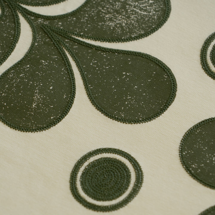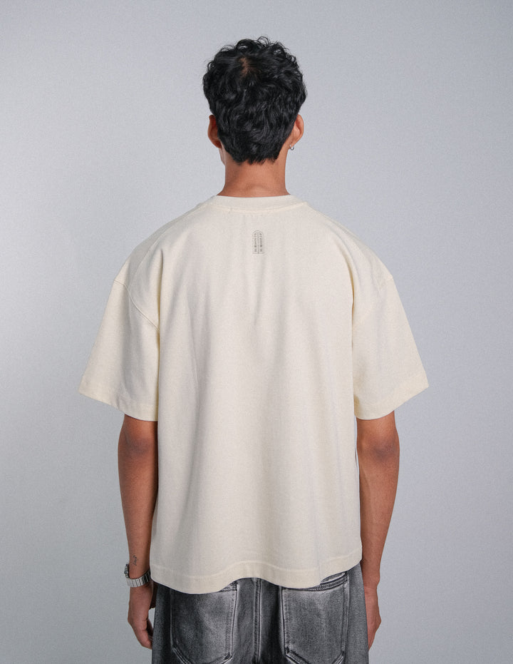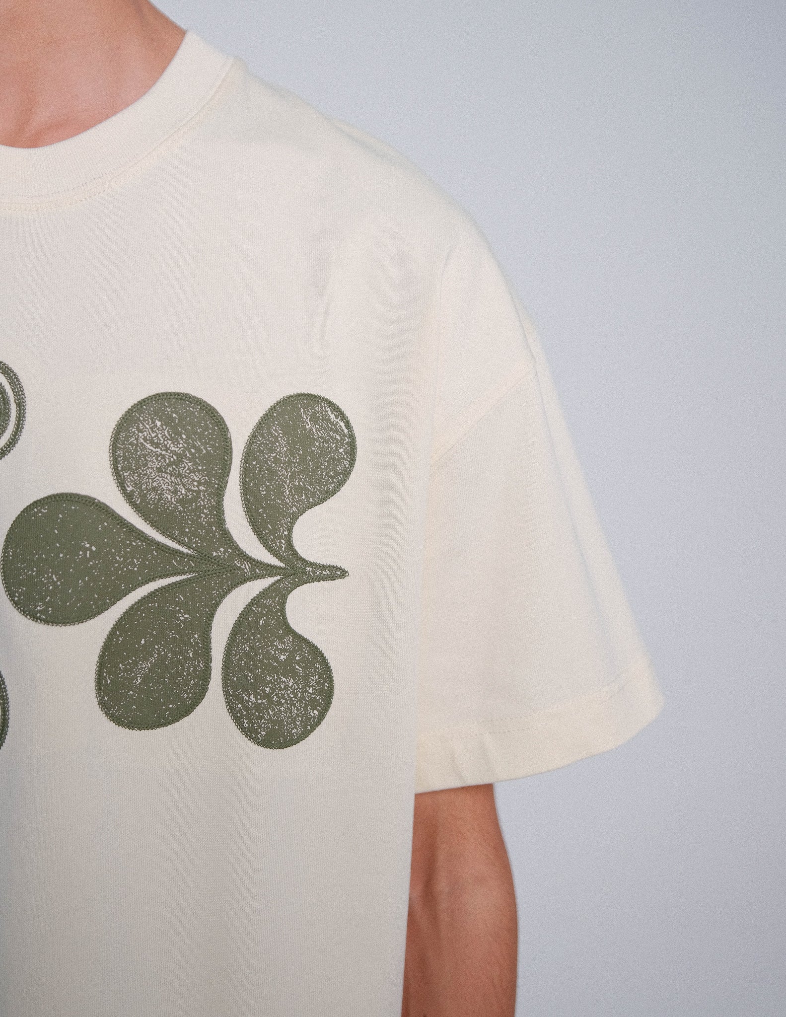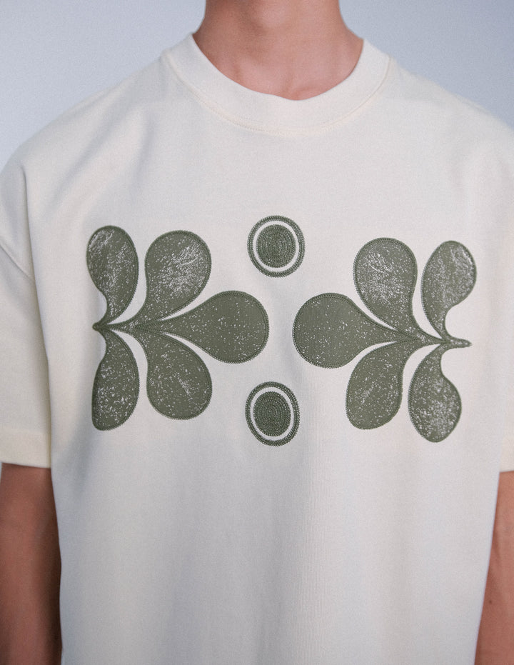 Camiseta boxy fit color crema con un estampado digital en el pecho color verde y un bordado chainstitch resaltando el detalle y calidad de la prenda, hecha en tela 100% algodón de 310 gr y cuello redondo en Rib