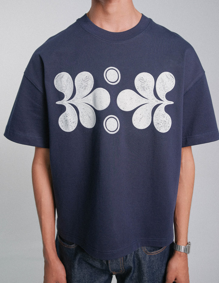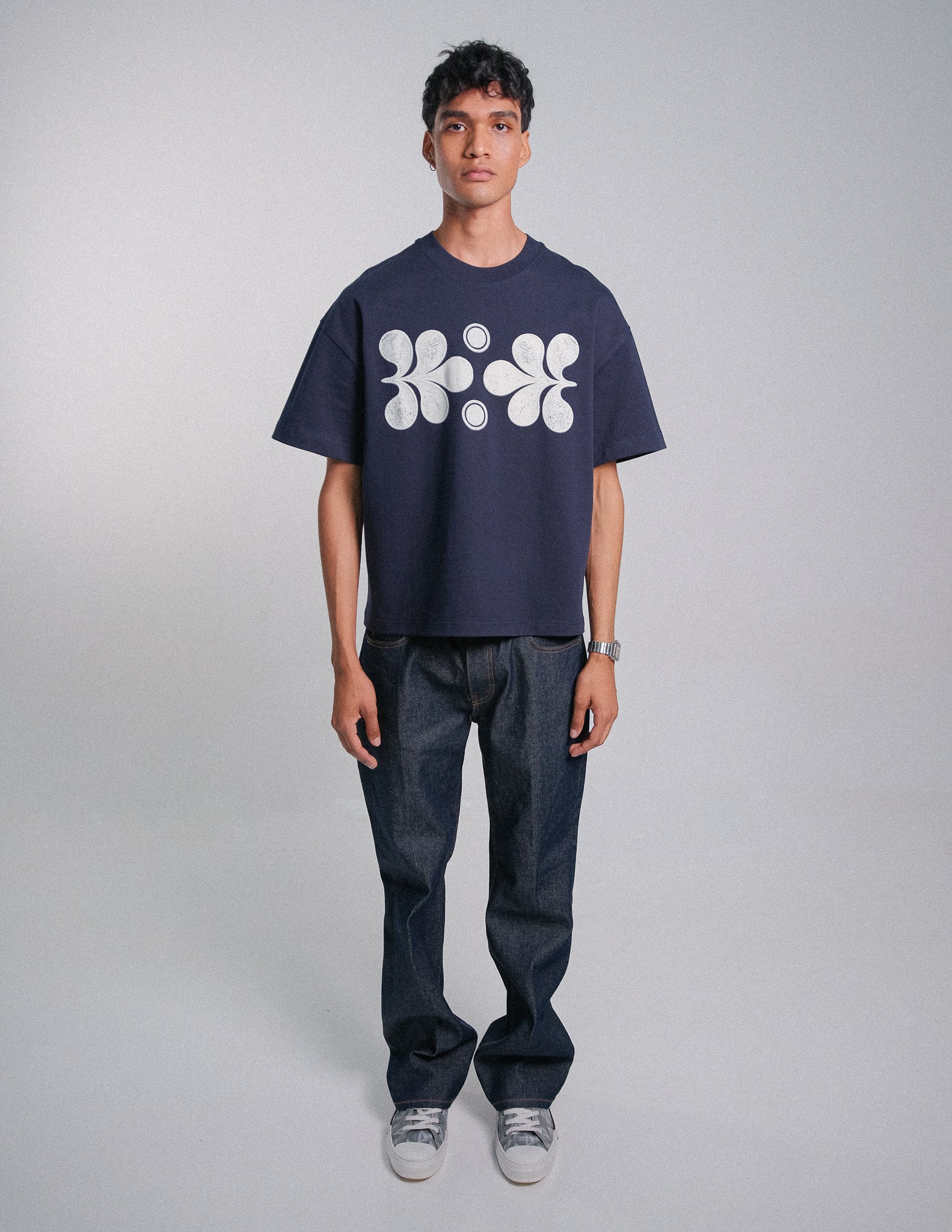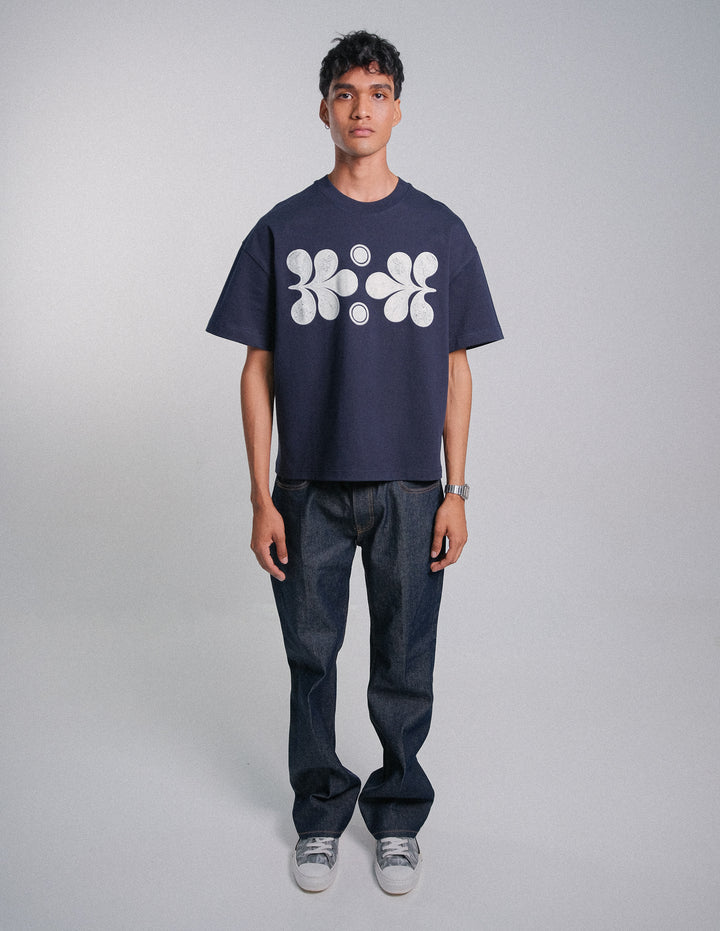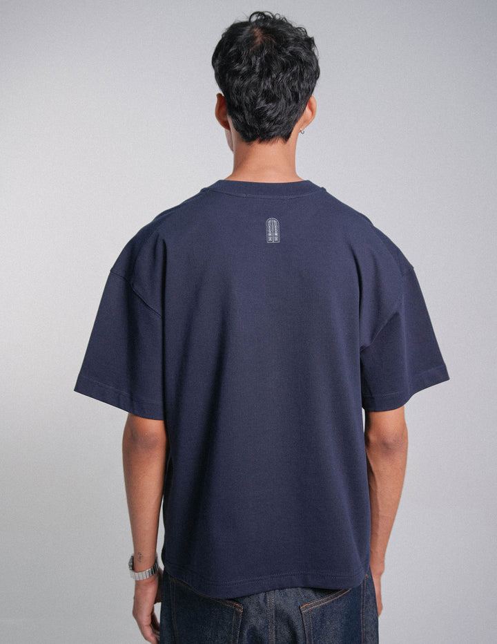Camiseta boxy fit color azul navy con un estampado digital en el pecho color blanco hueso y un bordado chainstitch resaltando el detalle y calidad de la prenda, hecha en tela 100% algodón de 310 gr y cuello redondo en Rib
