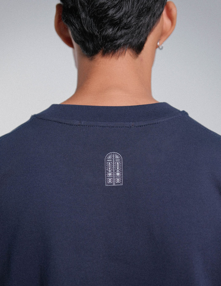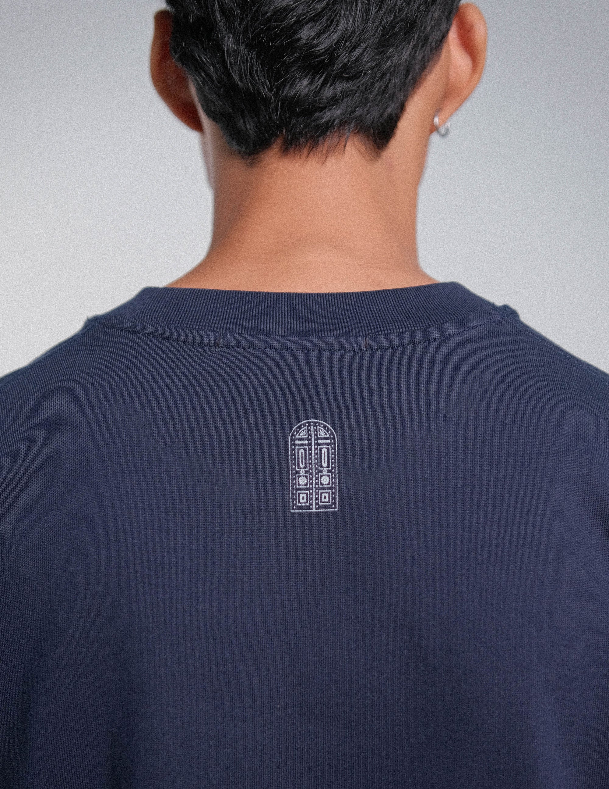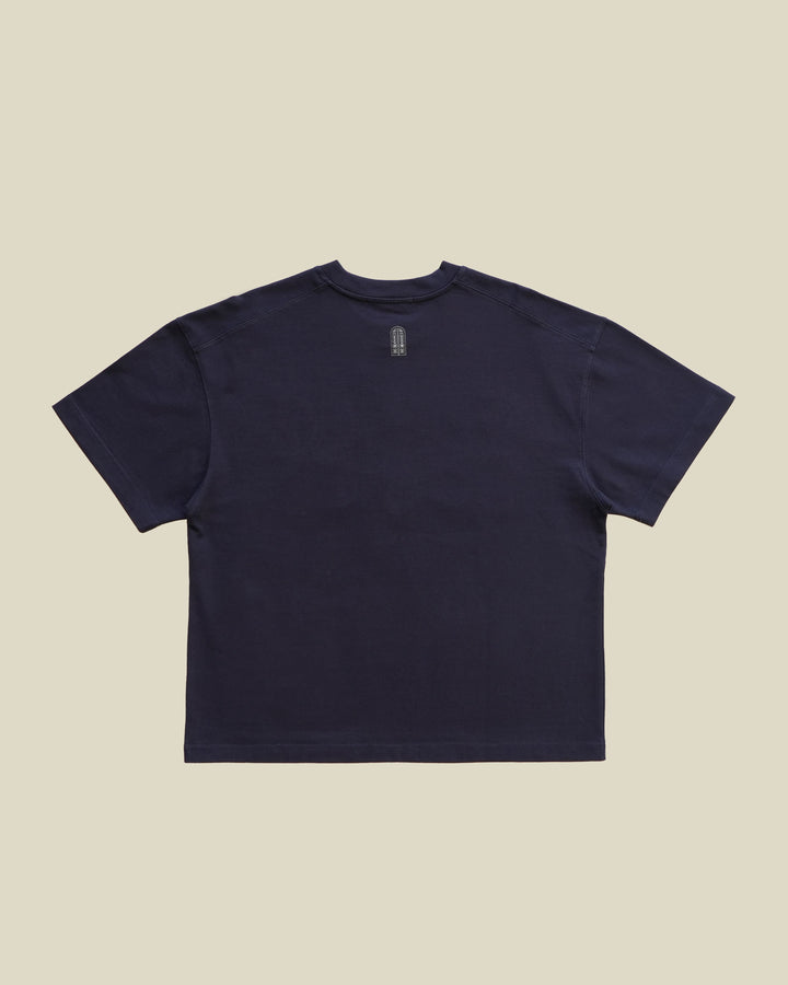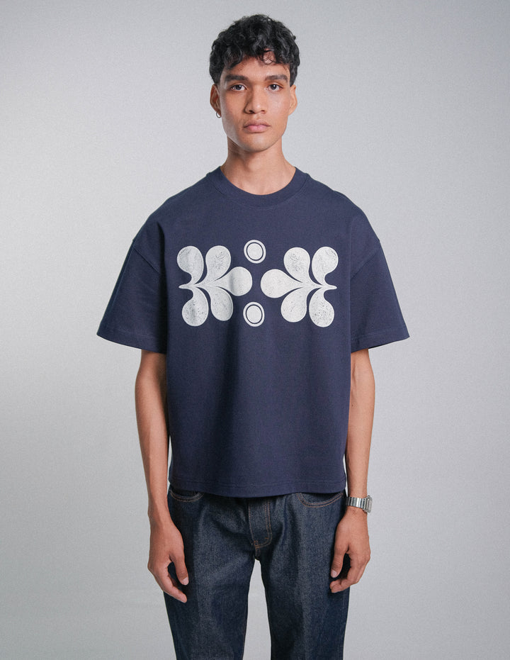 Camiseta boxy fit color azul navy con un estampado digital en el pecho color blanco hueso y un bordado chainstitch resaltando el detalle y calidad de la prenda, hecha en tela 100% algodón de 310 gr y cuello redondo en Rib