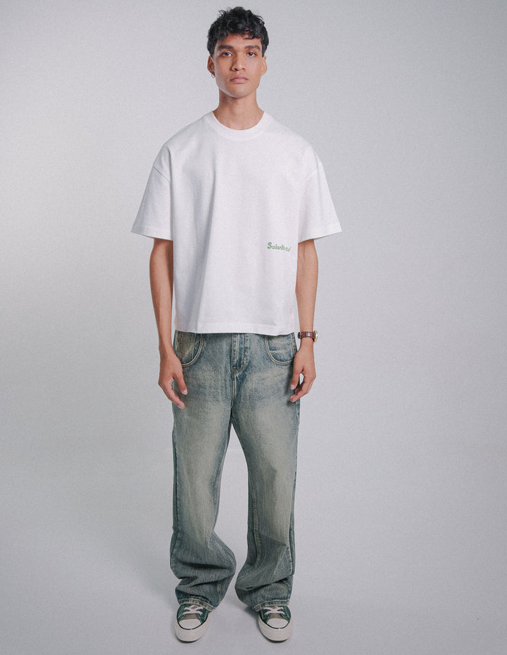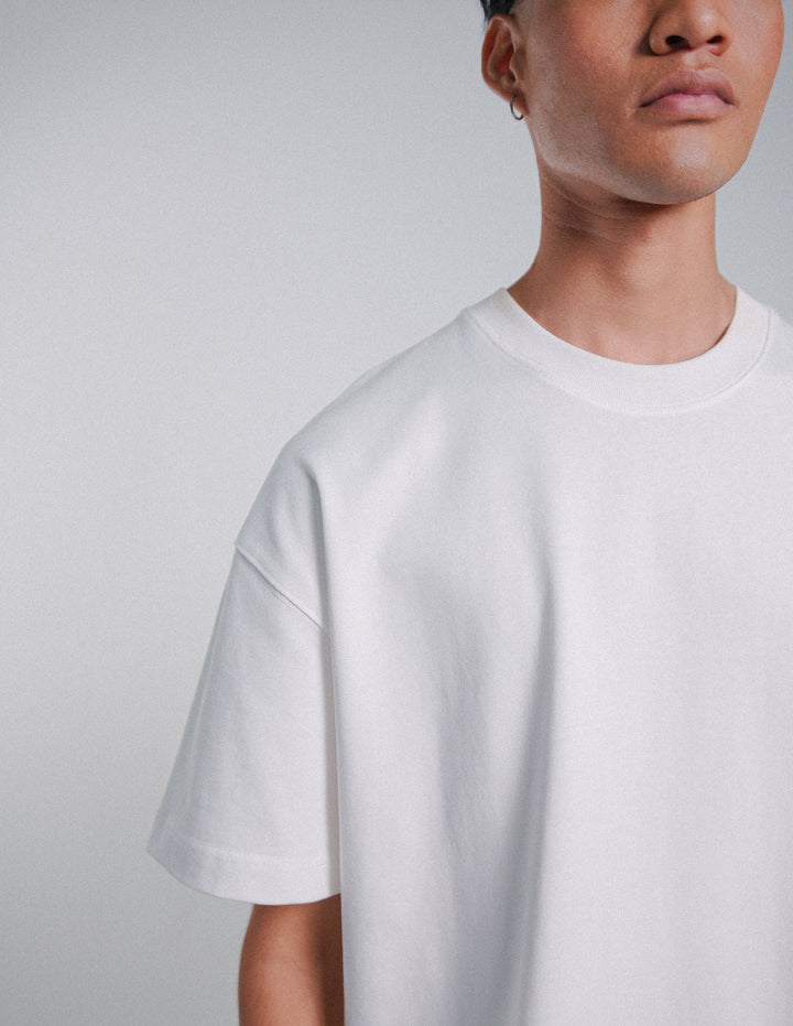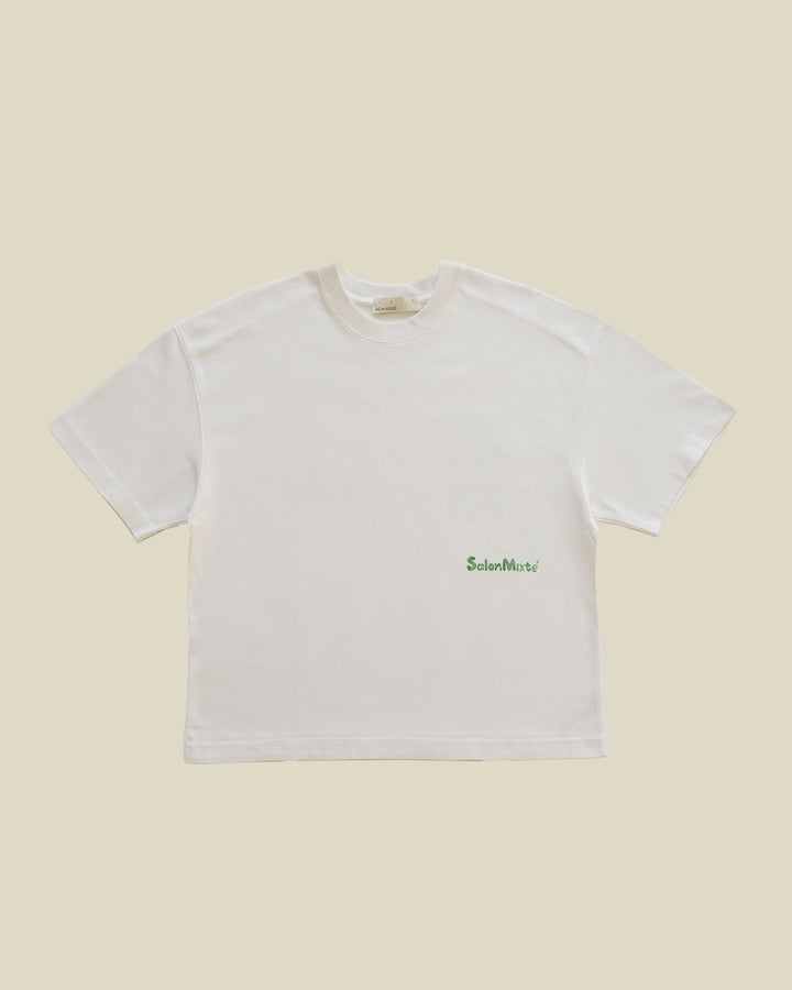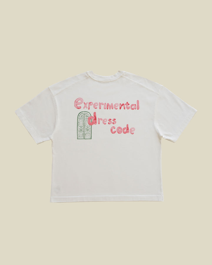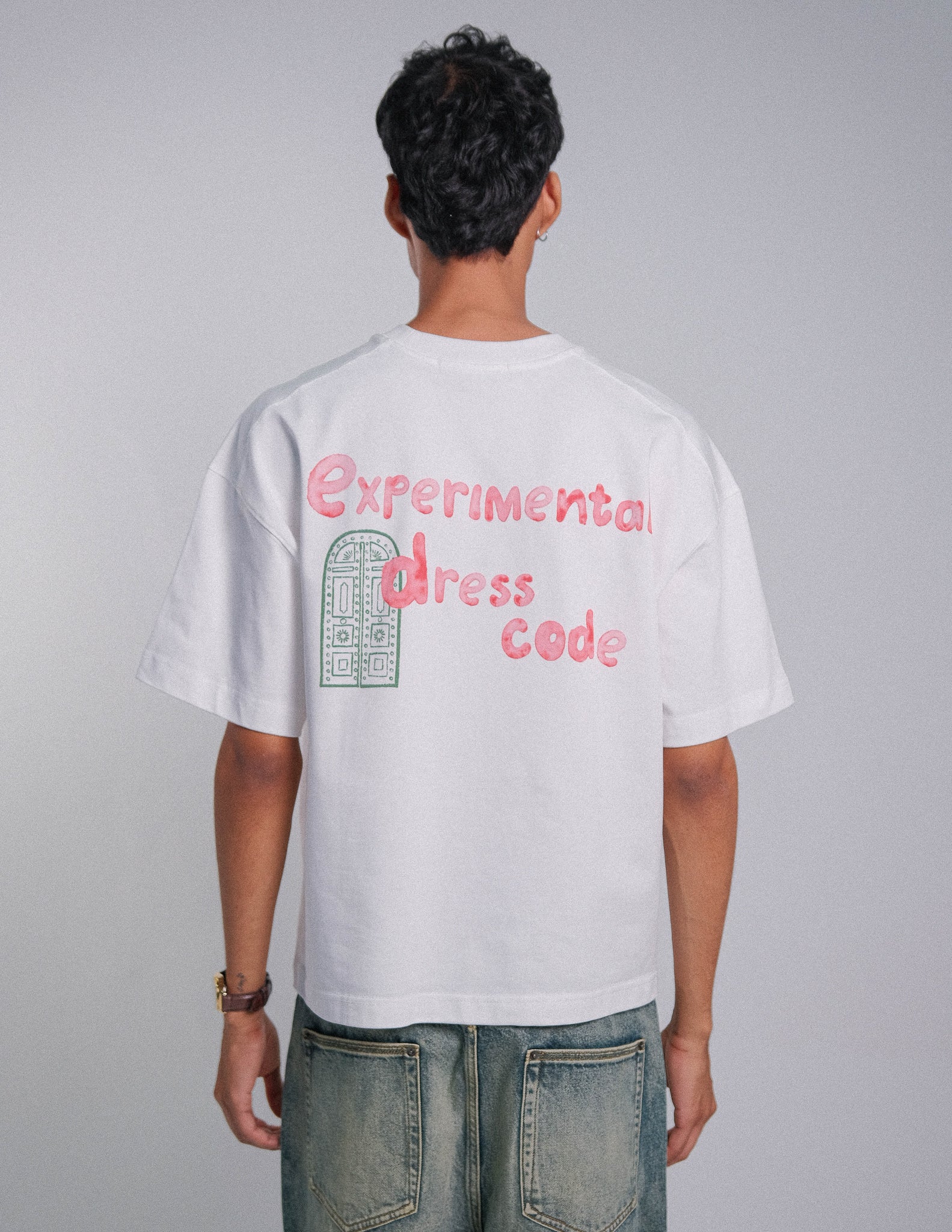 Camiseta boxy fit color blanco con una ilustracion en estampado digital en el pecho y en la parte trasera una ilustracion con la frase experimental dresscode, hecha en tela 100% algodón de 310 gr y cuello redondo en Rib