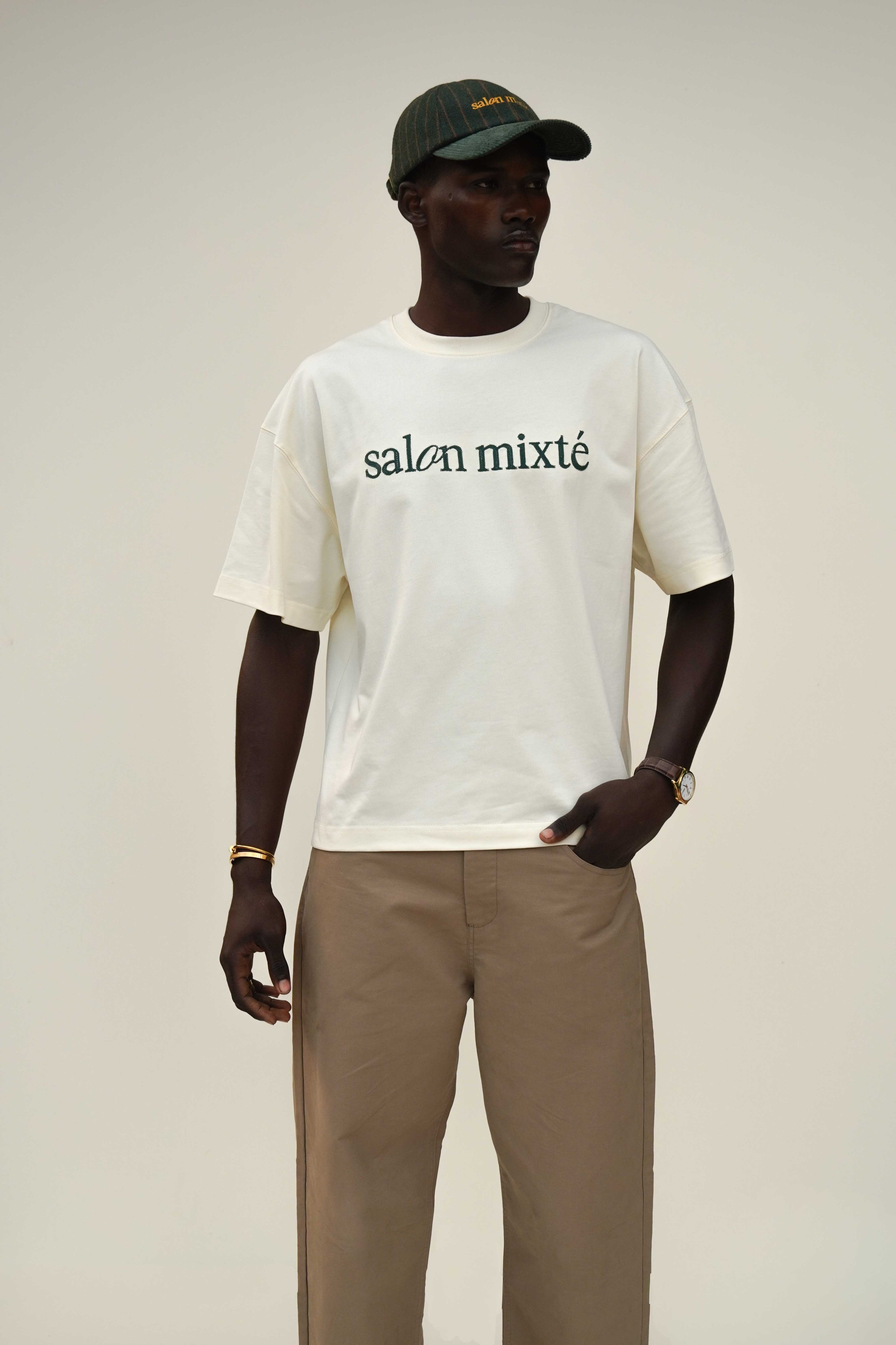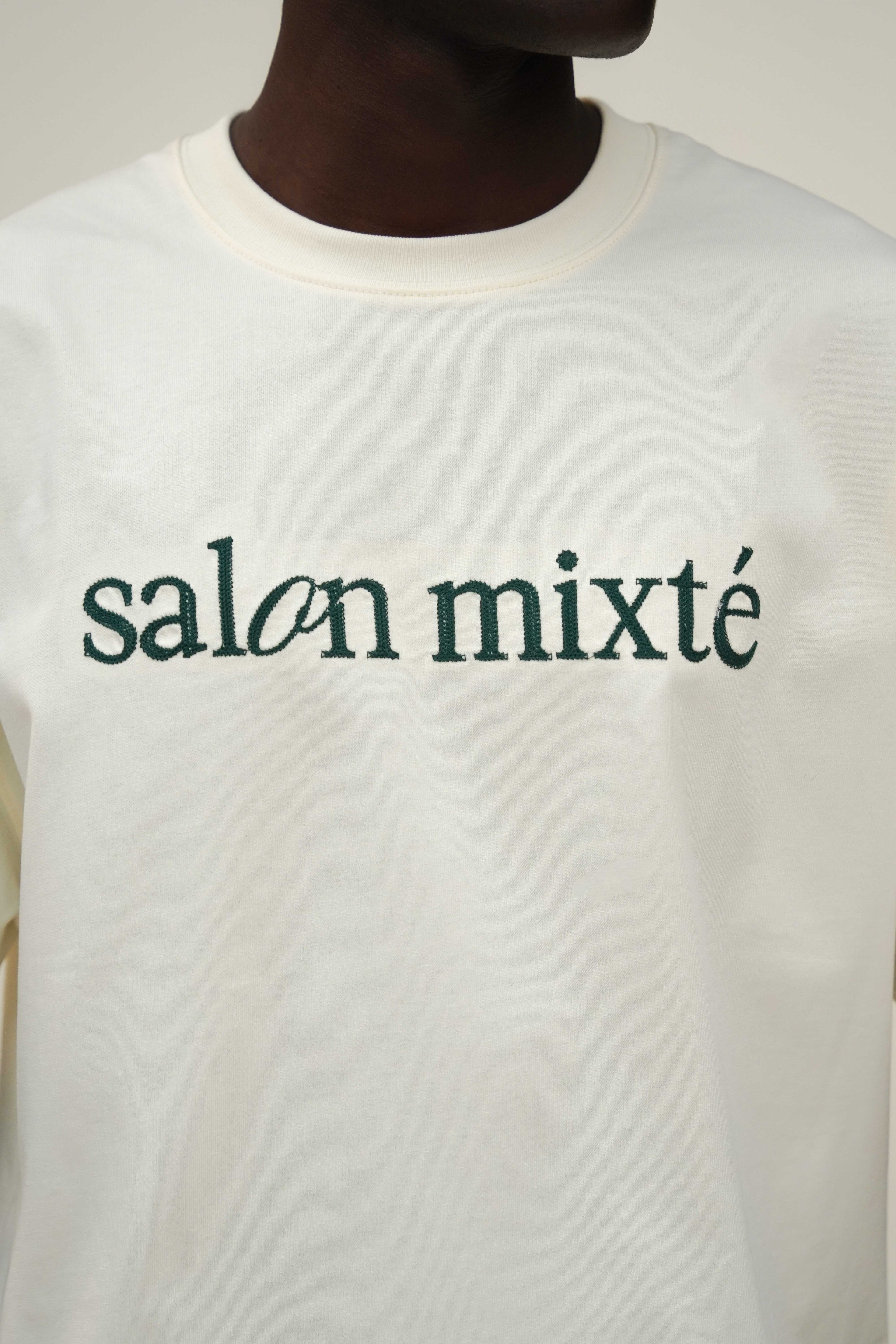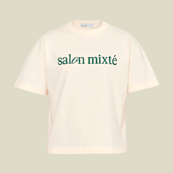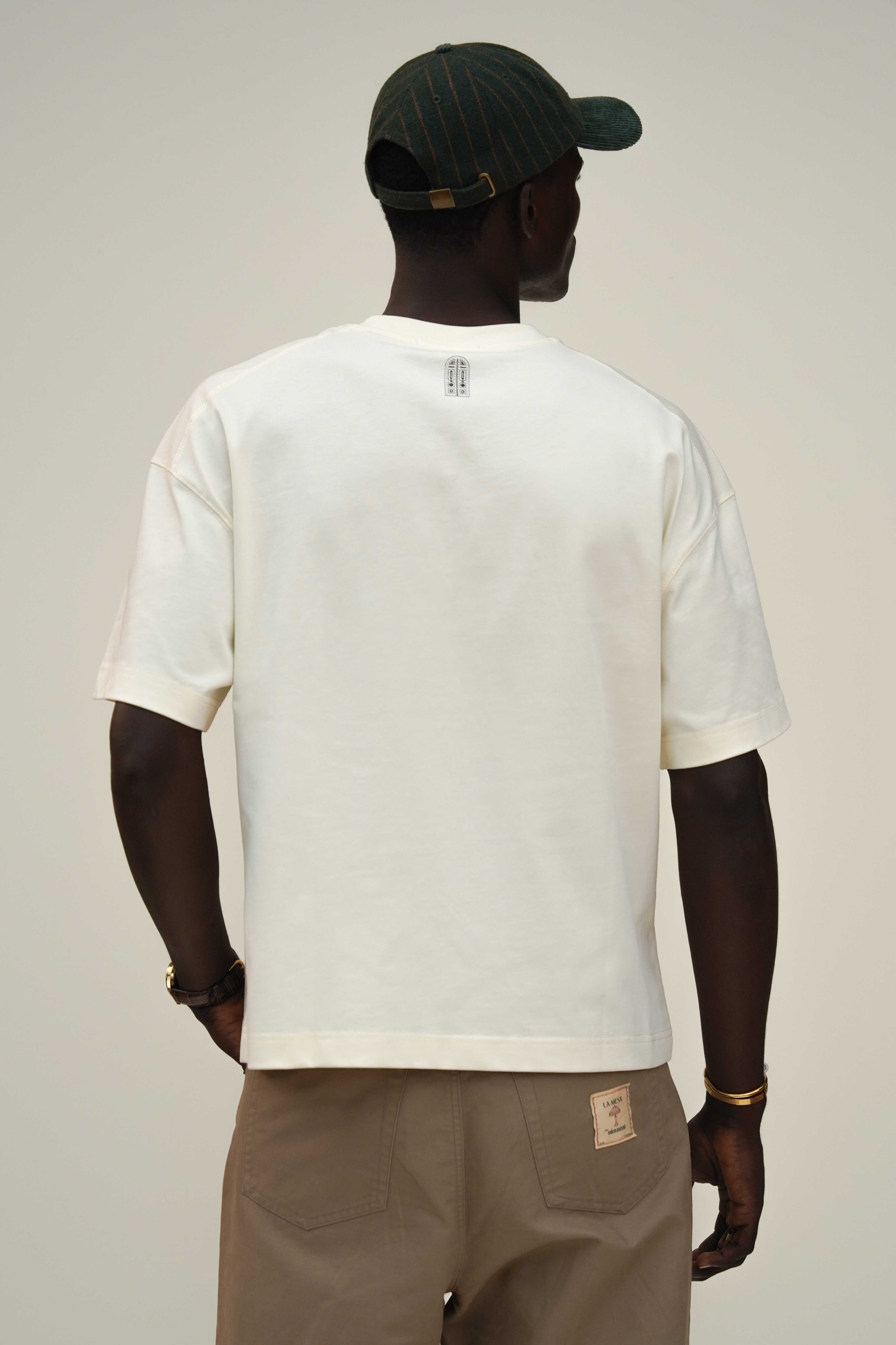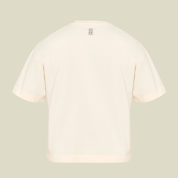 Camiseta boxy fit color crema con el logo bordado con hilos color verde en el pecho y en la parte trasera tiene una pequeña estampacion, hecha en tela 100% algodón de 300 gr y cuello redondo en Rib