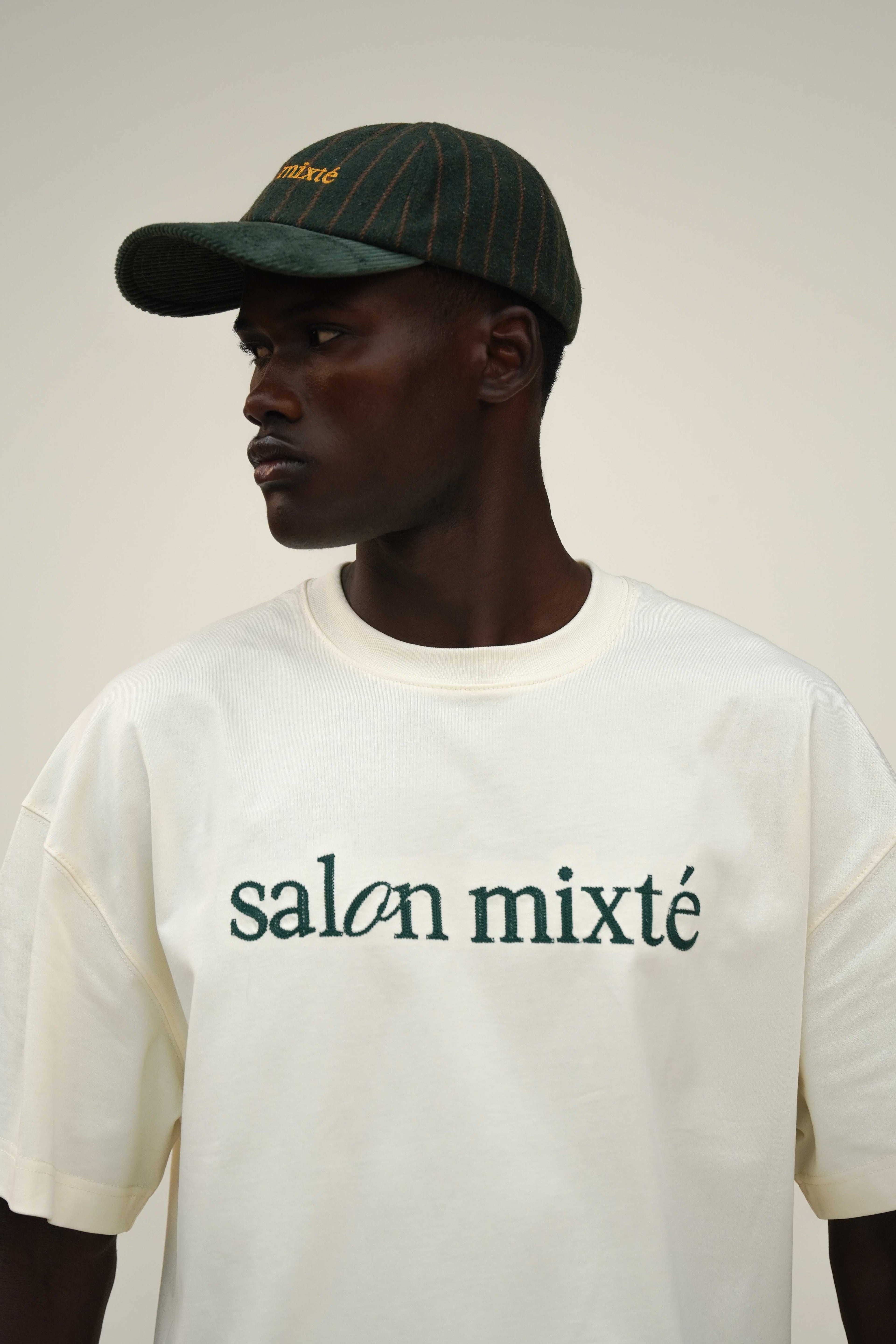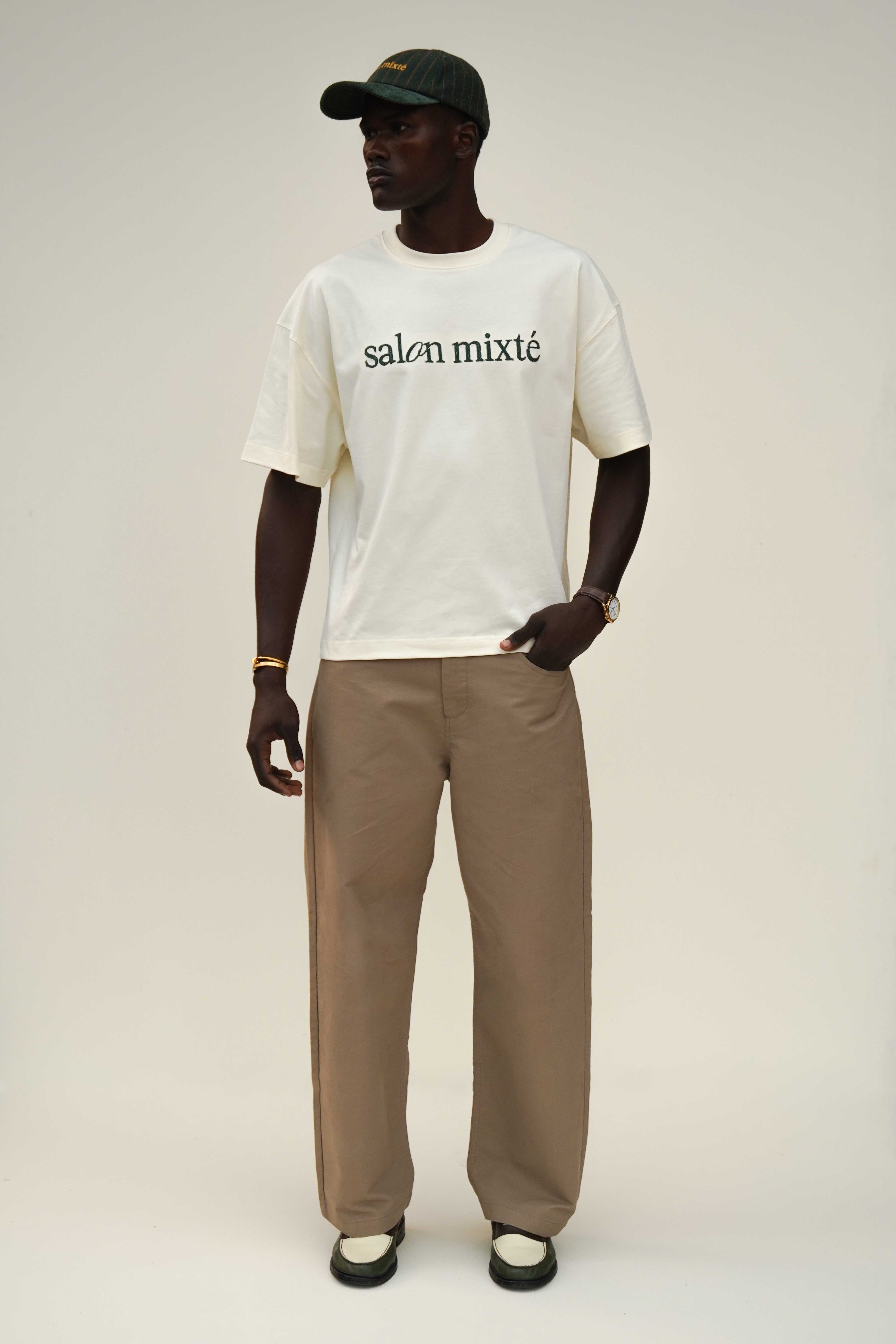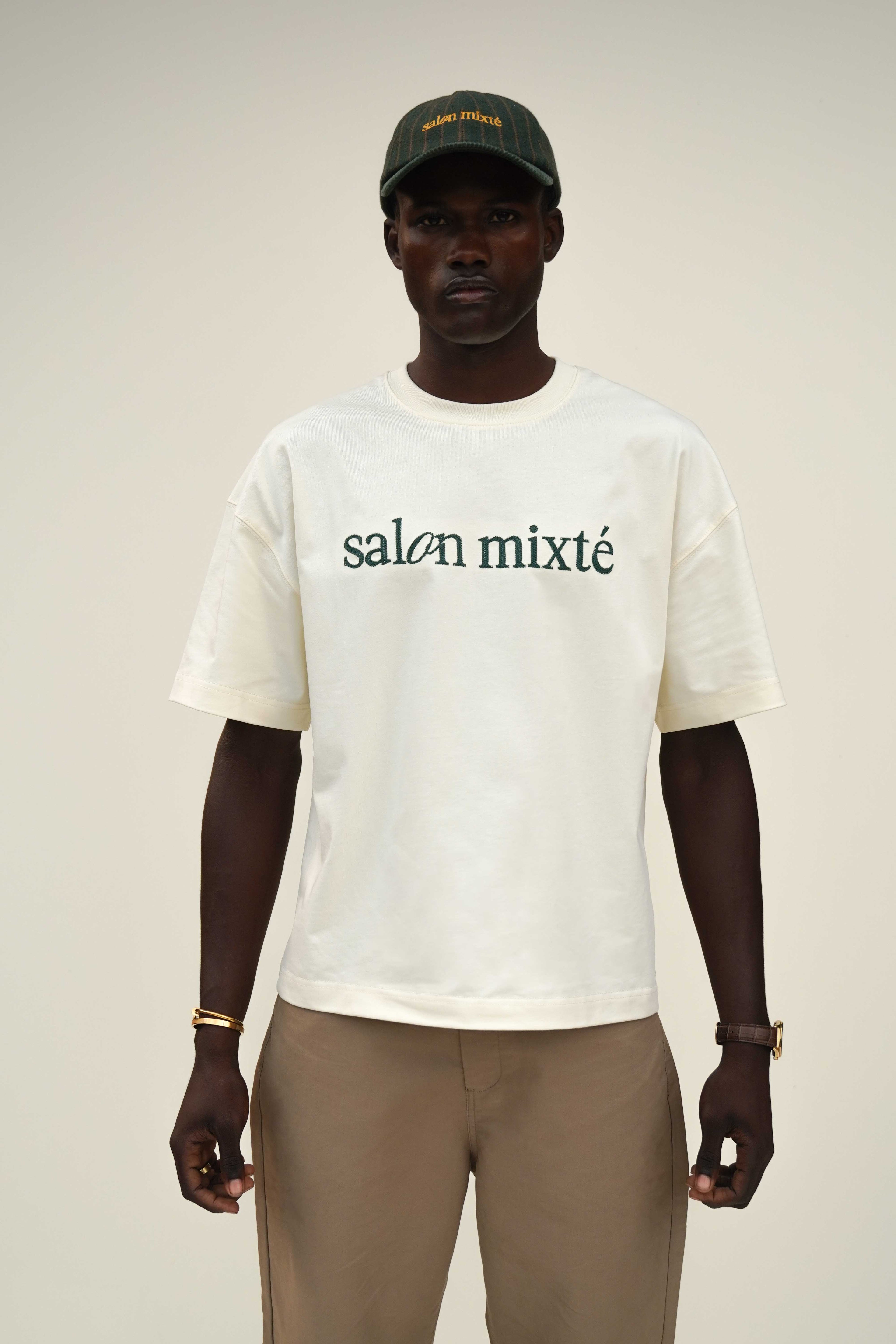 Camiseta boxy fit color crema con el logo bordado con hilos color verde en el pecho y en la parte trasera tiene una pequeña estampacion, hecha en tela 100% algodón de 300 gr y cuello redondo en Rib