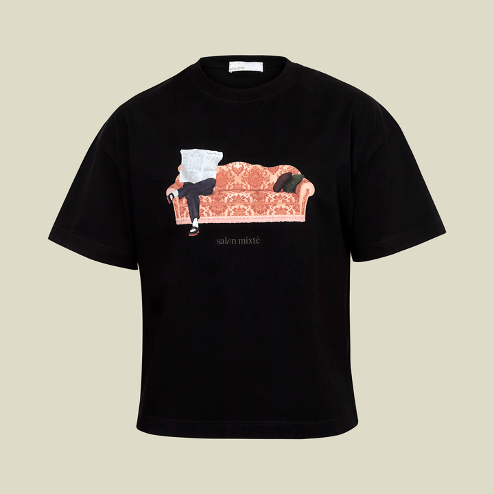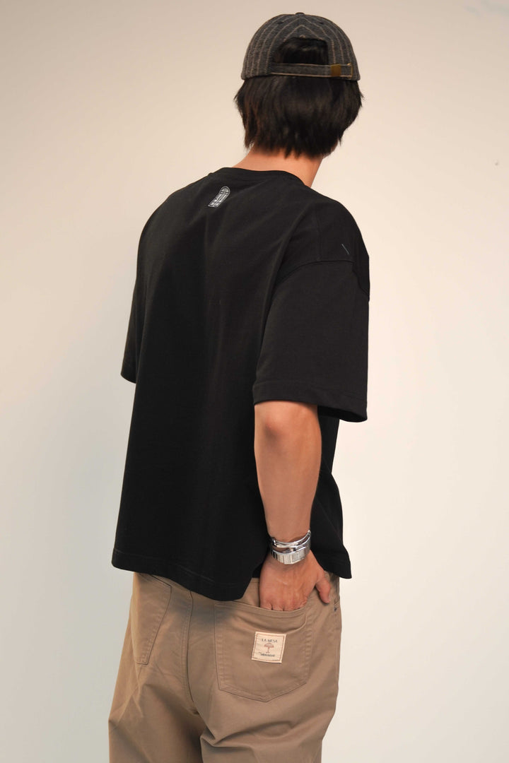 Camiseta boxy fit color negro con una ilustración en estampado digital en el pecho y en la parte trasera tiene una pequeña estampación, hecha en tela 100% algodón de 300 gr y cuello redondo en Rib
