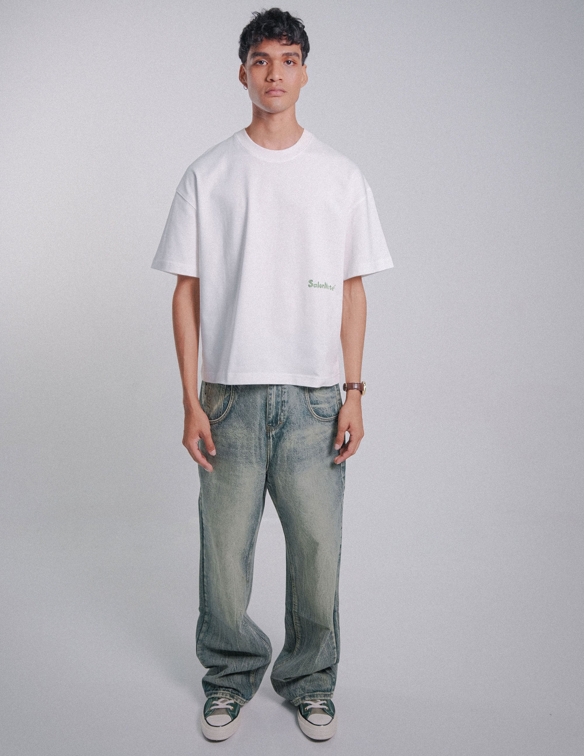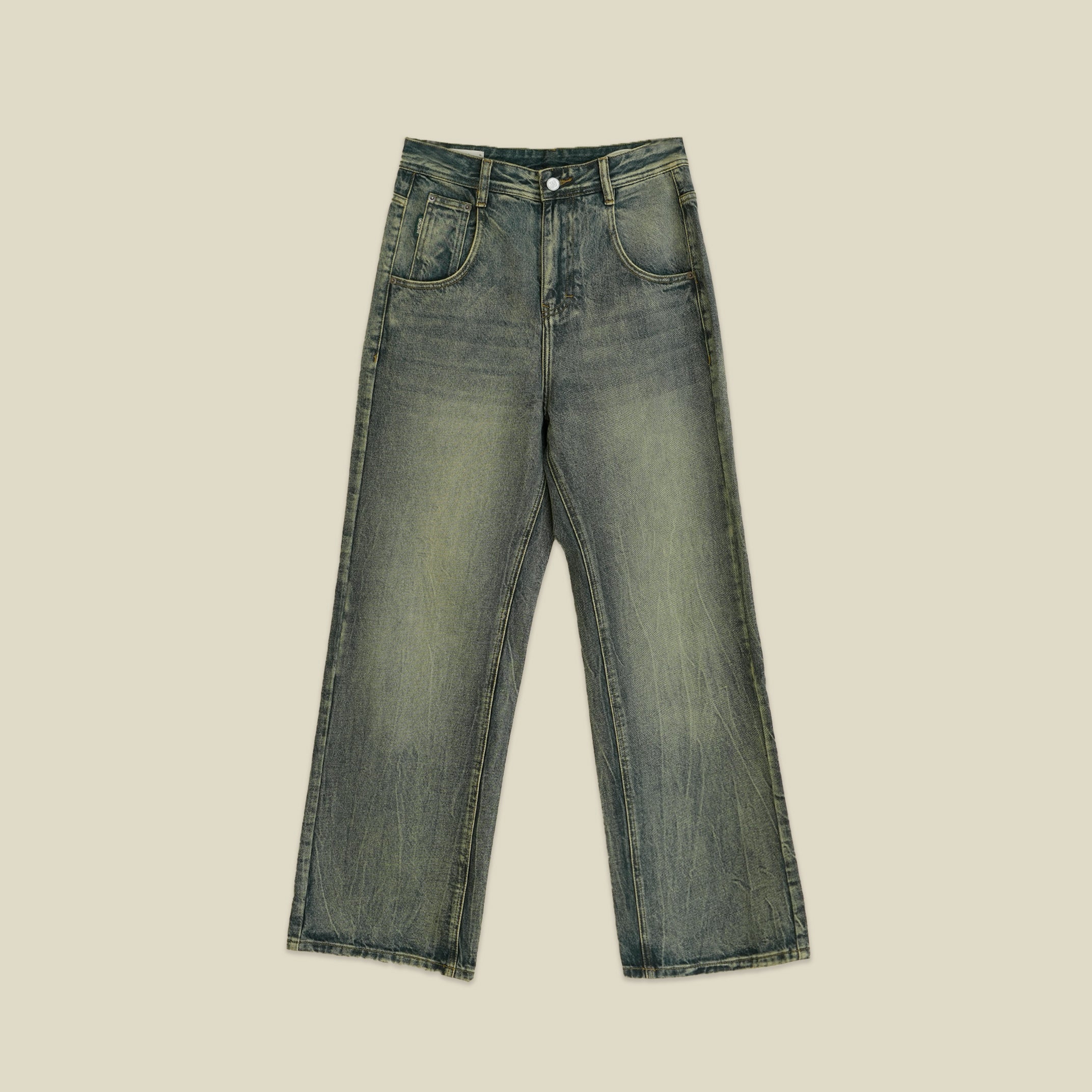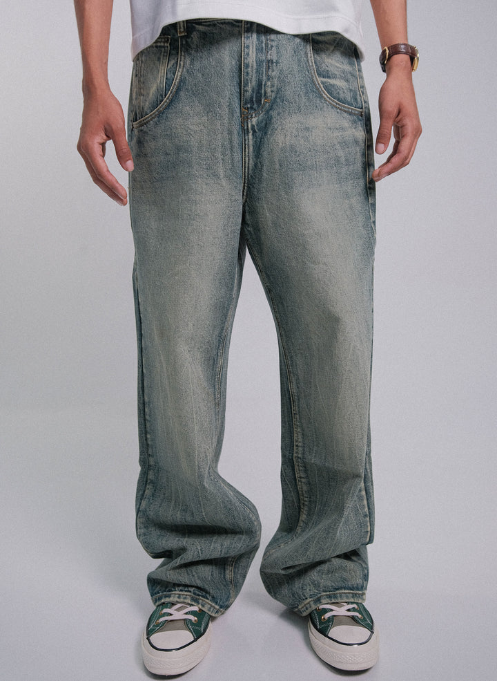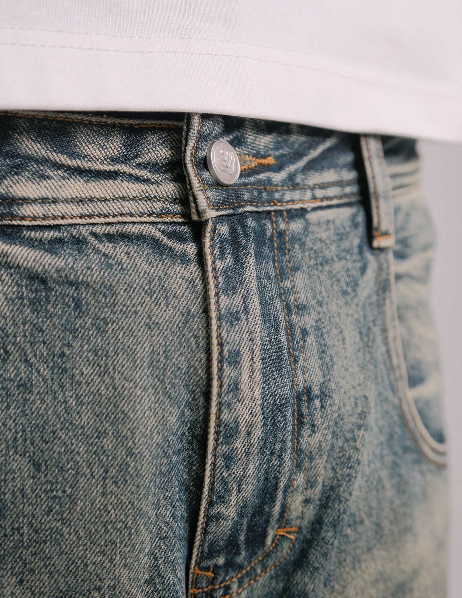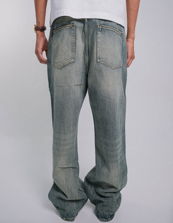 Jean baggy fit. Cinco bolsillos. Efecto lavado con acabado con un poco de color, cierre frontal y boton
