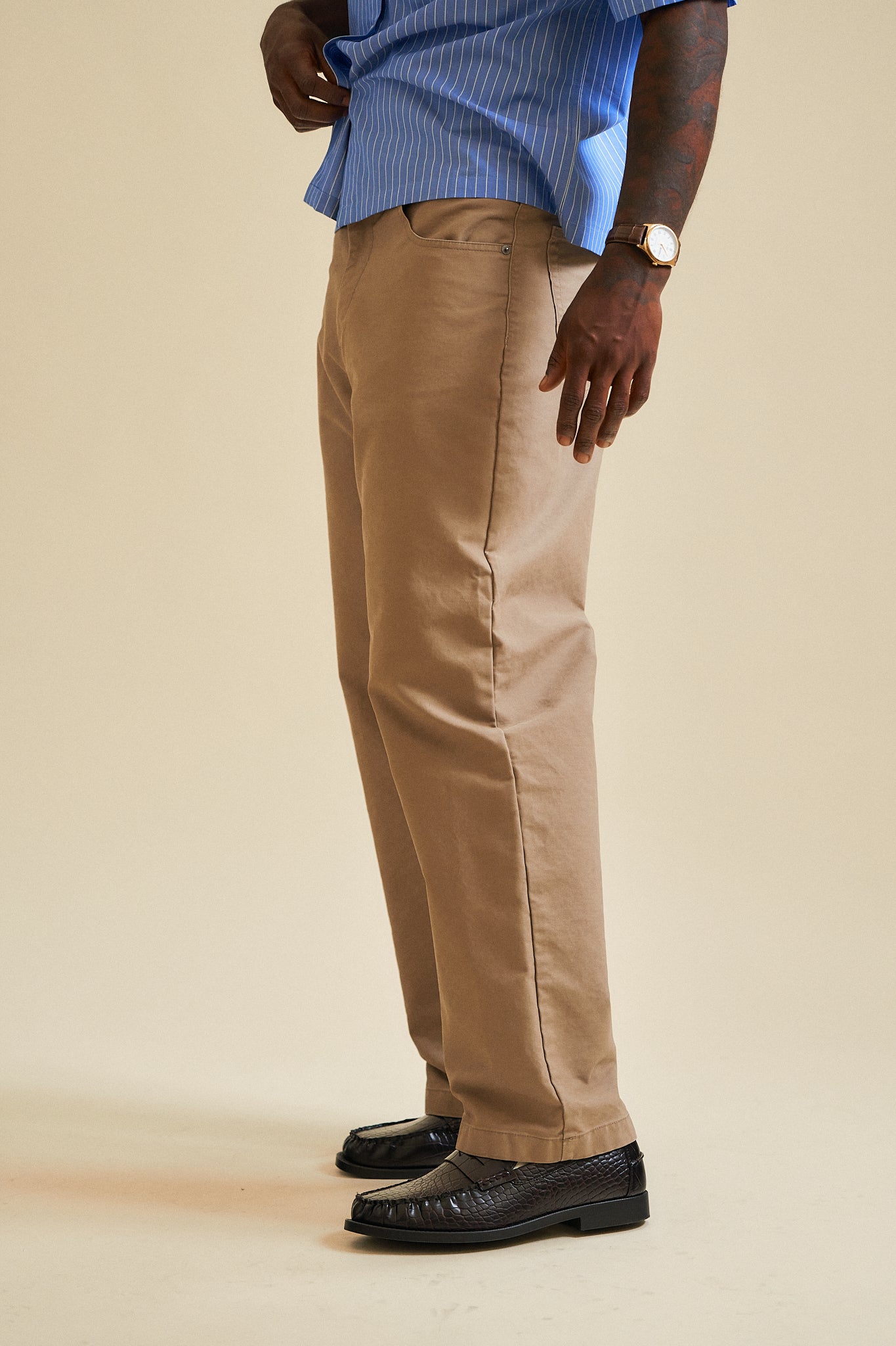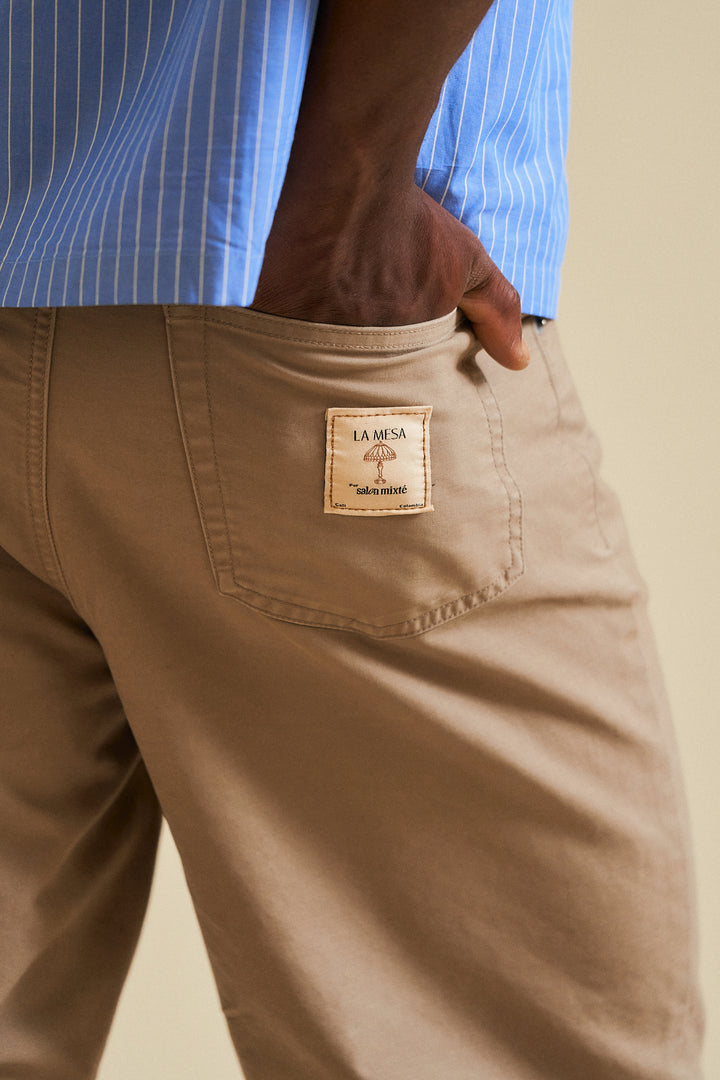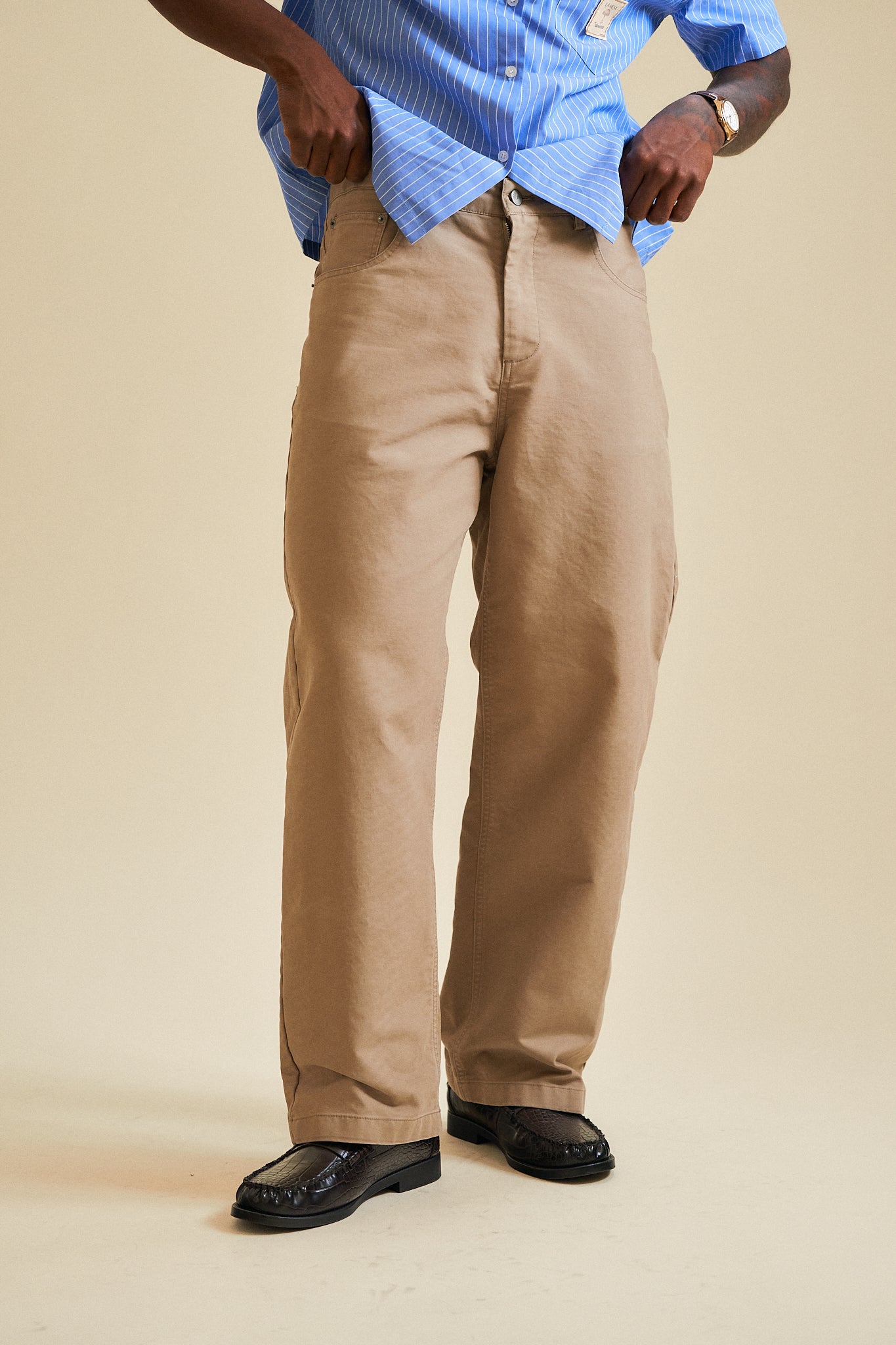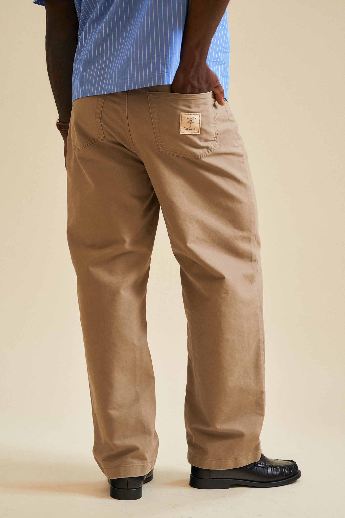 Pantalon color caqui cinco bolsillos en una horma wide leg, con un detalle en el bolsillo trasero derecho de una etiqueta ilustrada con el logo de la colección, hecho en 100% algodón.